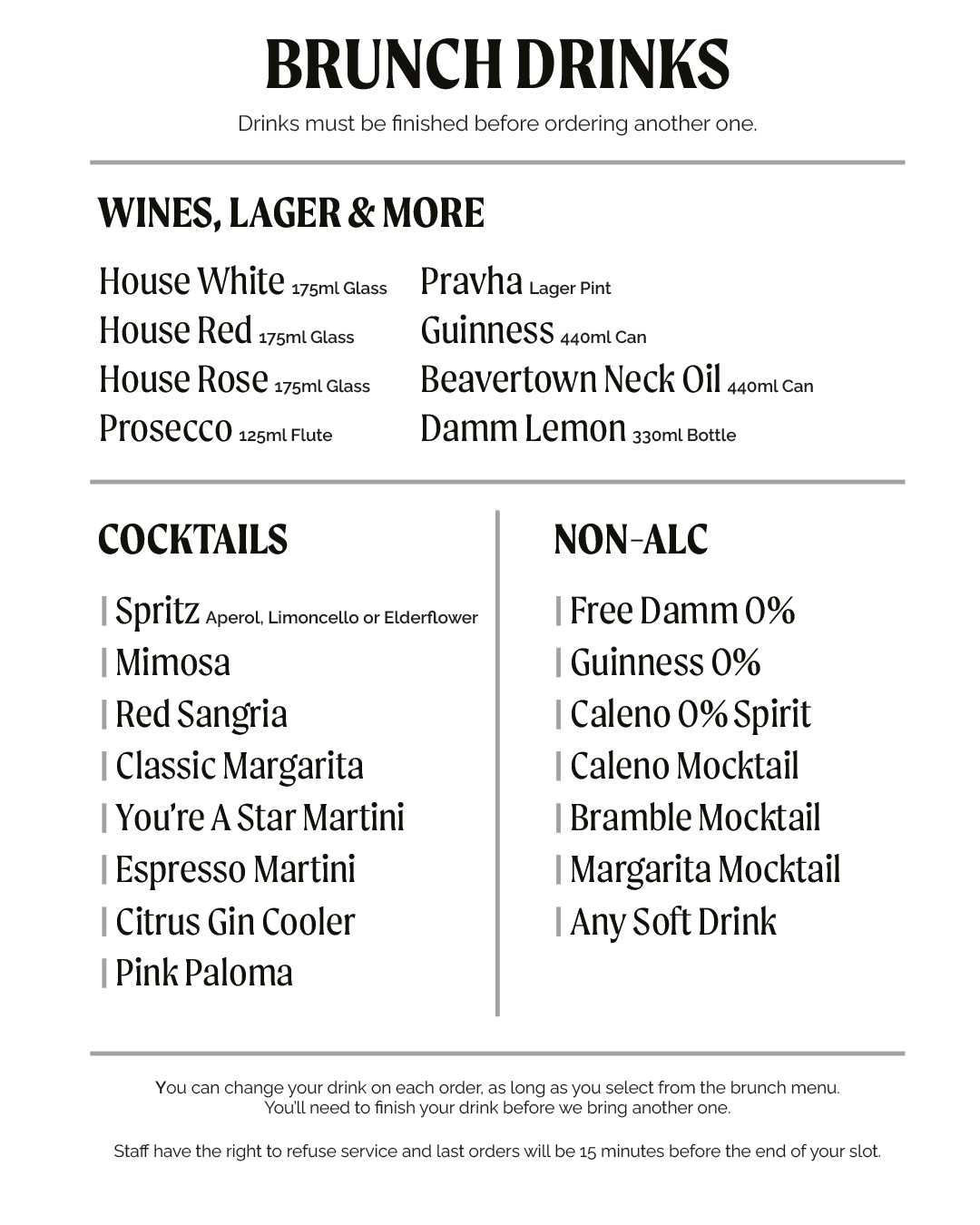 - Drinking: you can change your drink on each order, as long as you select from the bottomless menu. You’ll need to finish your drink before we bring another one.